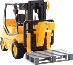 A valósághű, műanyag targonca 1:14 méretarányban örömet okoz a 3 éves kortól ajánlott kis építőknek. Gombnyomásra hangokat ad ki és világít, ami fokozza a valósághű raktáras vagy építkezős játékélményt. A működésről 3× AG13/LR44 elem gondoskodik, amelyek a csomag részét képezik.