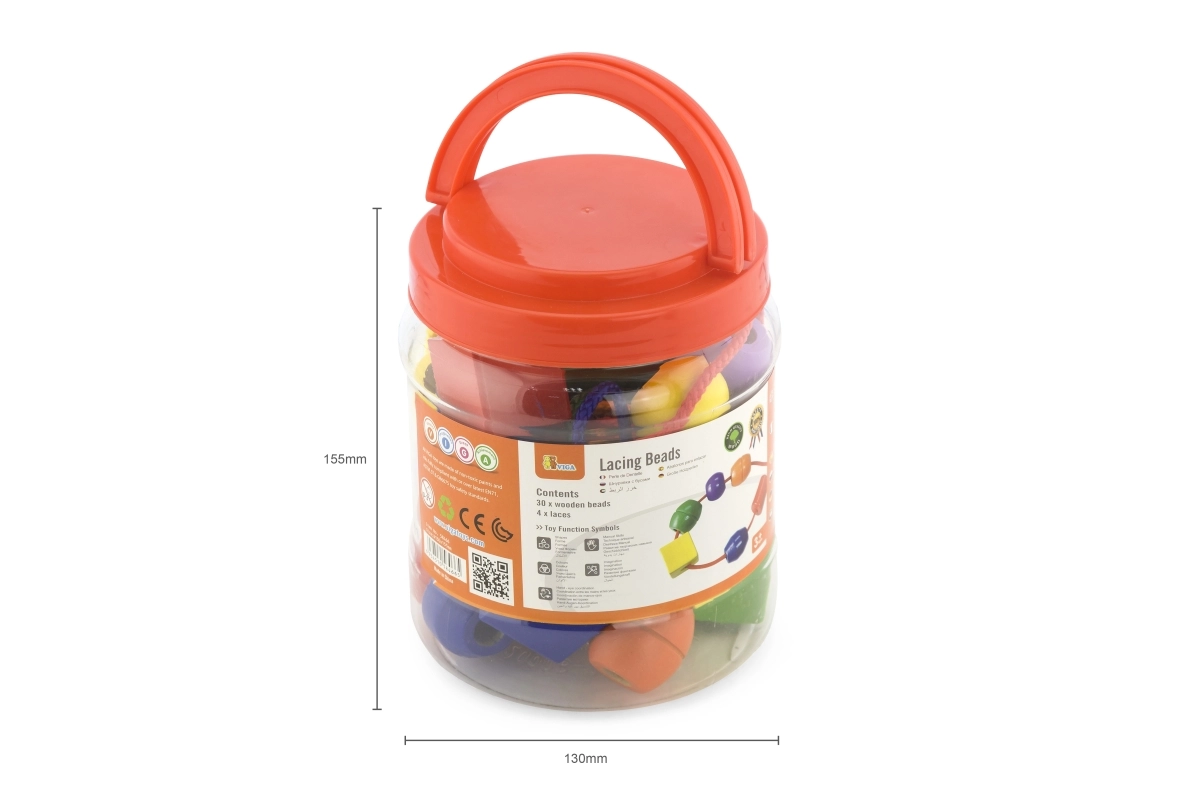 A gyöngyök tartós műanyag dobozban, tetővel kerülnek tárolásra, ami megkönnyíti a hordozást és az elpakolást. A készlet játékos tanulást kínál otthon és óvodában, és remek kiegészítő a Montessori tevékenységekhez.
