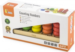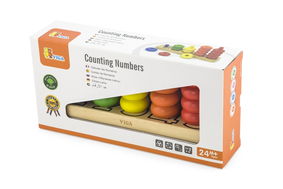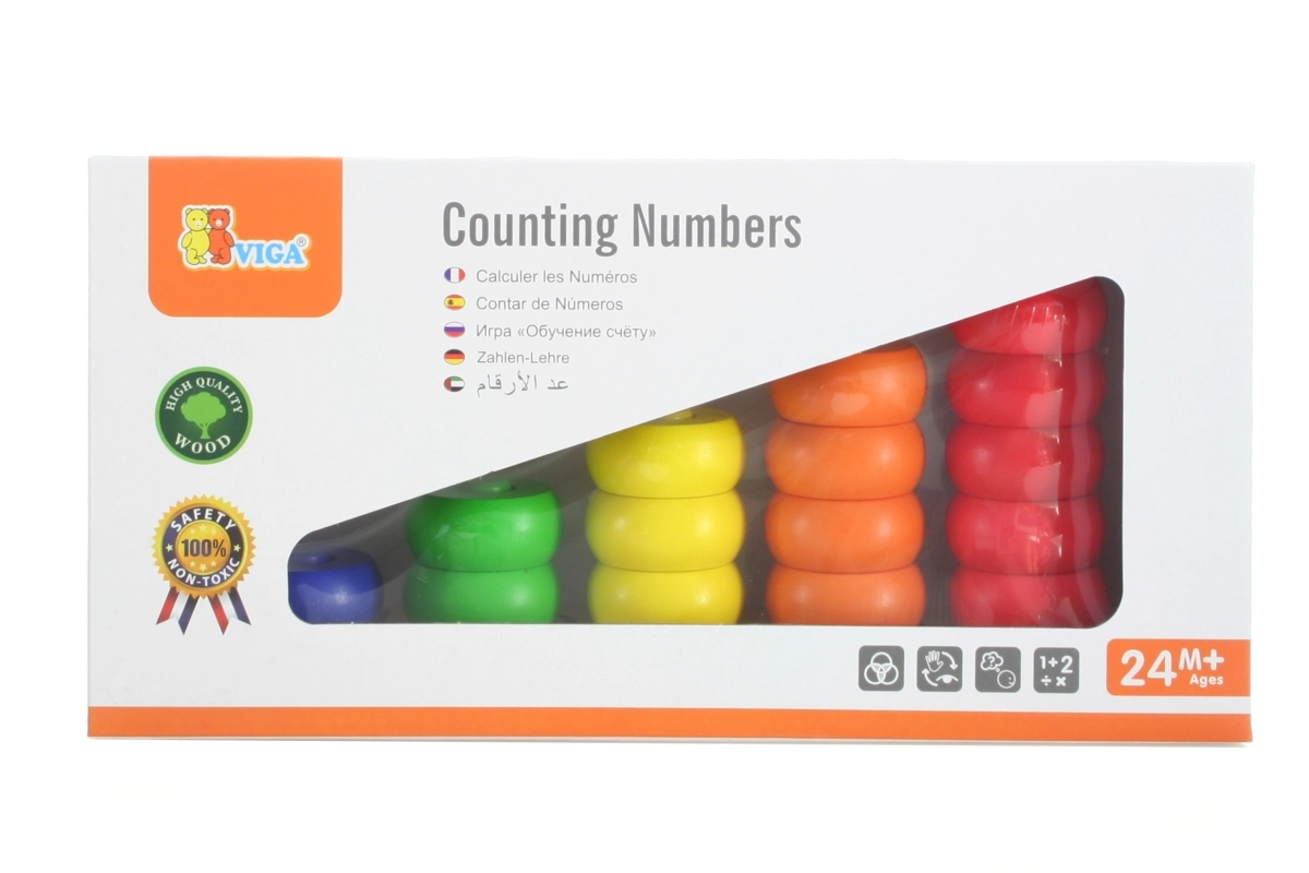 Ez a tartós fa számoló biztonságos és intuitív tanulási lehetőséget kínál a gyerekeknek. A masszív alapon függőleges rudak vannak, amelyekre a gyerekek színes gyűrűket fűznek, szín és mennyiség szerint válogatnak, és gyakorolják az első számtani készségeket. A játék fejleszti a logikus gondolkodást és a koncentrációt.