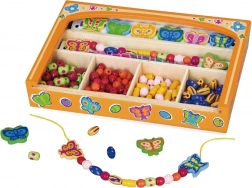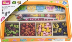 Ez a gazdag fa gyöngykészlet változatos színeket, formákat és méreteket kínál, amelyekkel a gyerekek könnyedén készíthetnek saját karkötőket vagy nyakláncokat. Az áttekinthető tárolás a masszív fa dobozban megkönnyíti a rendszerezést és a többszöri játékot.