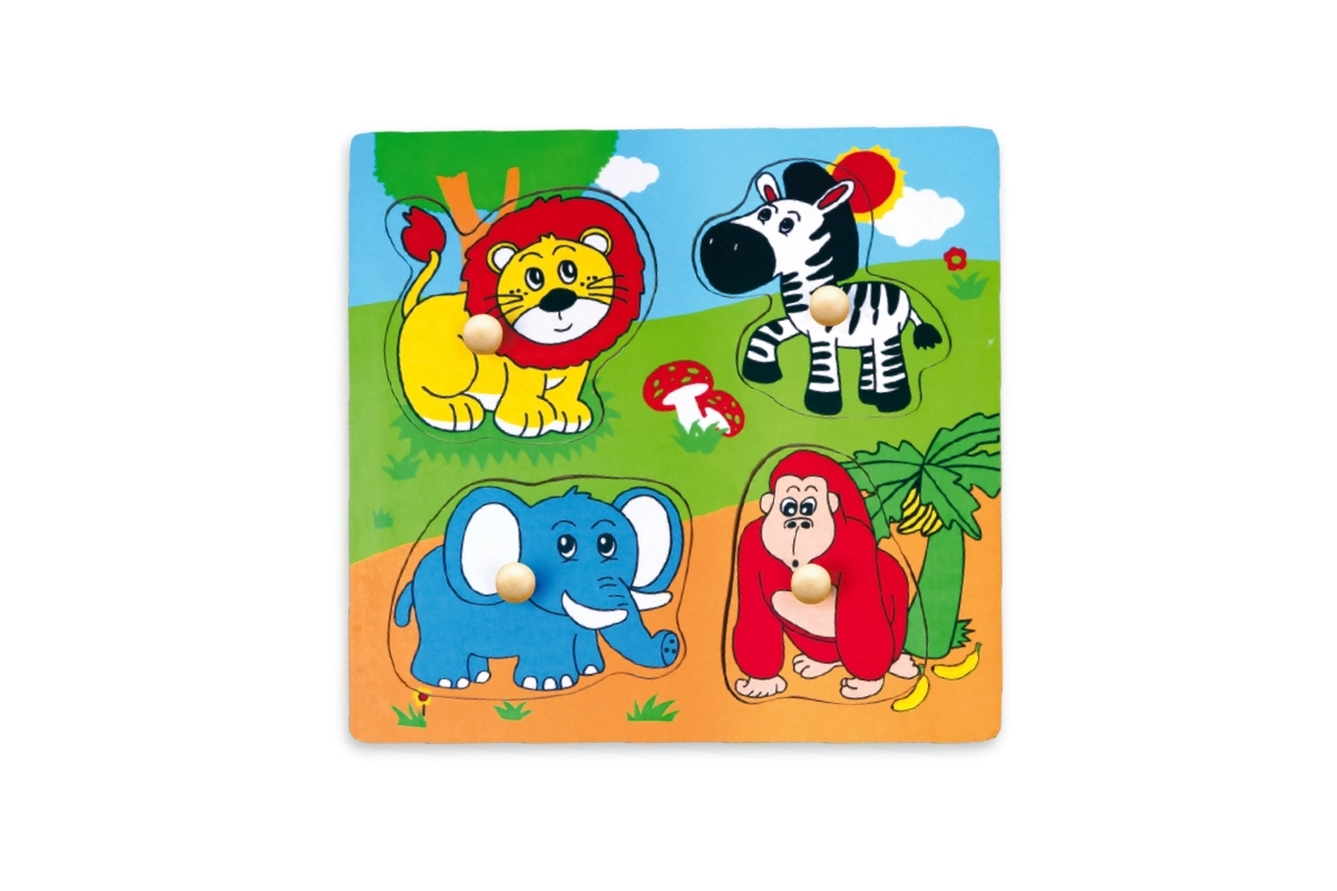 A színes képek – oroszlán, zebra, elefánt és gorilla – segítik a gyerekeket a formák, színek és a dzsungel állatneveinek felismerésében.