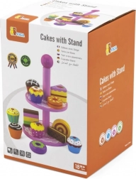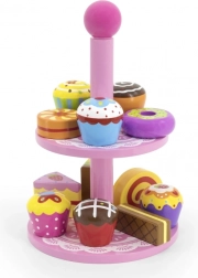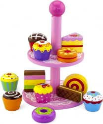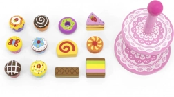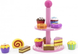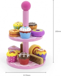 Fedezze fel a bájos készletet a gyerekkonyhába: két szintes állvány színes fa desszertekkel. A szett 12 süteményt és egy masszív rózsaszín állványt tartalmaz, amely támogatja a kreatív játékot, a finommotorikát és a szociális készségeket már 18 hónapos kortól.