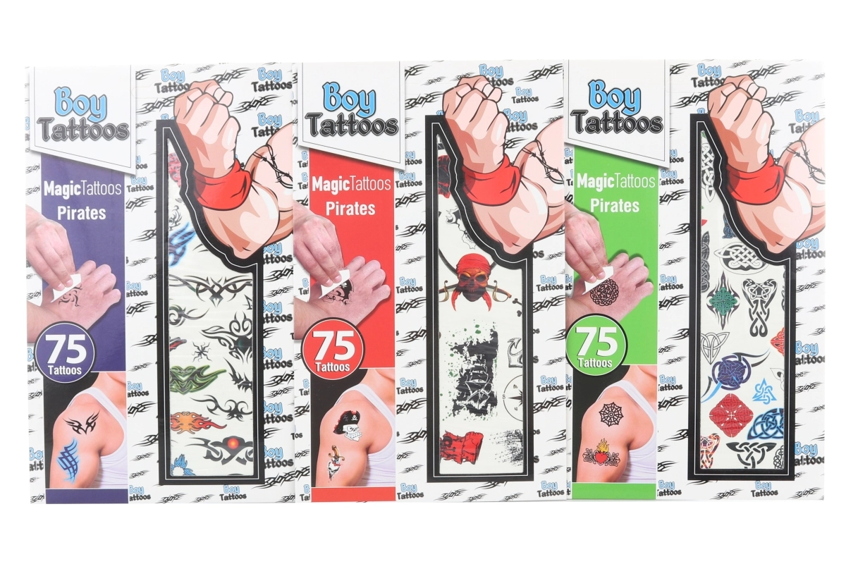 Szórakoztasd a kis kalandorokat kifejezetten fiúknak készült ideiglenes tetoválás készlettel. A csomag 75 különböző motívumot kínál, könnyű felvitelt és biztonságos használatot 3 éves kortól – ideális születésnapi bulikra, jutalomnak és mindennapi játékhoz.