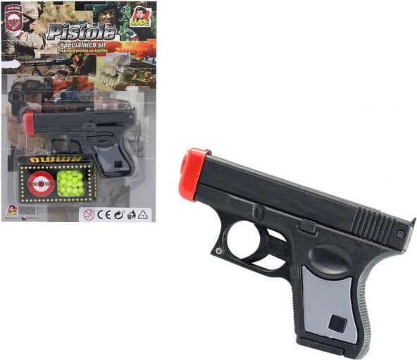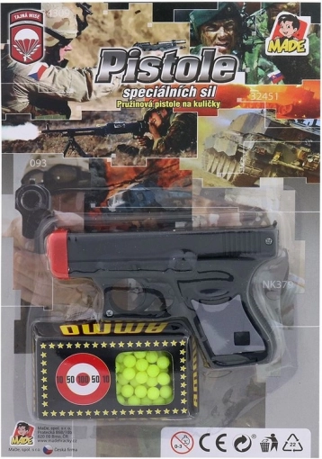 Szórakoztató gyermek golyós pisztoly 11 cm hosszúságban, 3 éves kortól kis lövészeknek. Tartozék golyókészlettel és cseh dizájnú csomagolással. Könnyű, biztonságos és könnyen kezelhető játék otthoni és szabadtéri játékhoz. Pótgolyók külön megvásárolhatók.