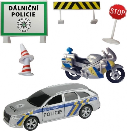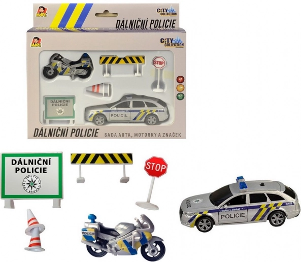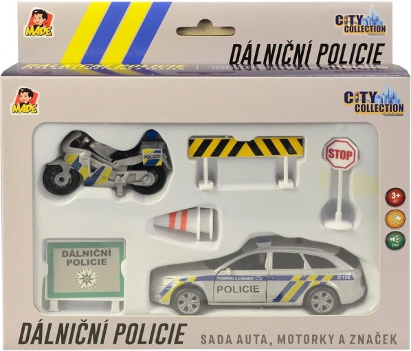 Autópályarendőrség City Collection készlet: fém autó fénnyel és hanggal, műanyag motor és közlekedési táblák. Visszahúzós meghajtás. Magyar dizájn. 3 éves kortól.
