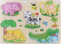Ez a fa, safari állatokkal díszített kirakó ideális eszköz az első tanuláshoz. A gyerekek gyakorolják a kéz–szem koordinációt, a formák felismerését és az állatok megnevezését – mindezt játékos formában. A masszív fa anyagnak köszönhetően a kirakó tartós, és mindennapos használatra is alkalmas.