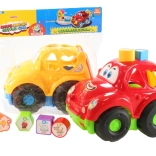 Vidám műanyag bedobós autó. Az autó mérete kb. 22 cm. 6 darab bedobható kockát tartalmaz betűkkel és képekkel. Kor: 12 hó+