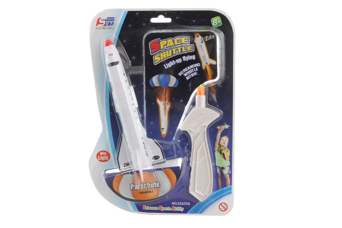 Kilövő űrrepülőgép fénnyel. A rakéta repülés közben sípol és világít. Tápellátás: 2× gombelem (AG3) – a csomag tartozéka. A rakéta mérete kb. 20,5 cm. A csomag mérete kb. 29,5 × 21 × 5 cm. Ajánlott életkor: 8+