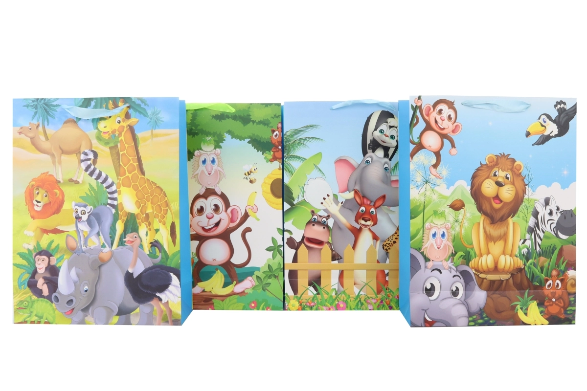 Stílusos, nagy méretű safari mintás ajándéktáska, amely örömet szerez minden megajándékozottnak. Körülbelül 50 × 40 cm-es méretének köszönhetően nagyobb ajándékok is beleférnek, a masszív kivitel pedig kényelmes és biztonságos hordozást biztosít. Remek választás születésnapra, ünnepekre és egyéb alkalmakra. Elérhető 4 különböző dizájnban safari motívumokkal.