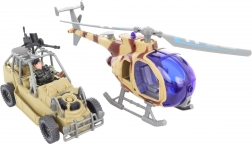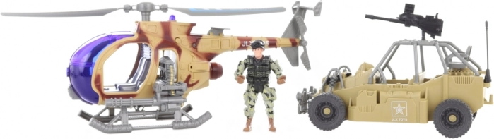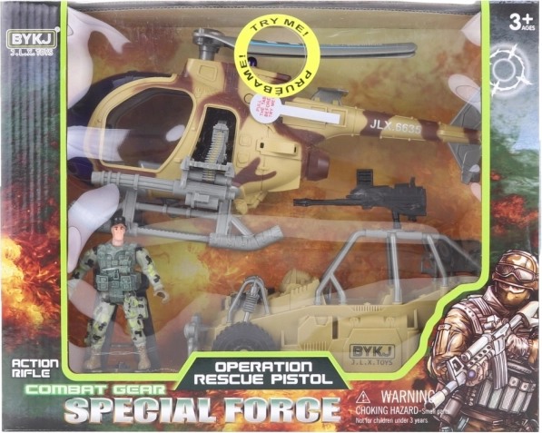 Ez a valósághű katonai készlet rengeteg szórakozást és teret ad a fantáziának. A helikopter gombnyomásra világít és hangot ad, ami fokozza a játékélményt. A készlet része még a páncélozott autó és a katona figura a teljes akciójelenetekhez.