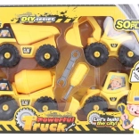 Építsd meg a saját építkezésedet a színes csavarozható autókészlettel. A gyerekek a mellékelt csavarhúzó és kulcs segítségével könnyedén összeszerelhetik és szétszerelhetik a rakodót, markolót, betonkeverőt és billenőplatós teherautót. A játék támogatja a kreativitást, a koordinációs készségeket, és szórakoztató formában türelemre tanít.
