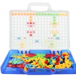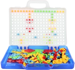 Minden a hordozható koff erben kap helyet, amelynek fedele pegboard-ként szolgál, így a készlet könnyen hordozható és elpakolható. Remek eszköz a finommotorika, a szem-kéz koordináció, a kreativitás és a türelem fejlesztéséhez.