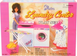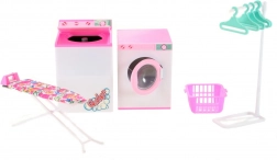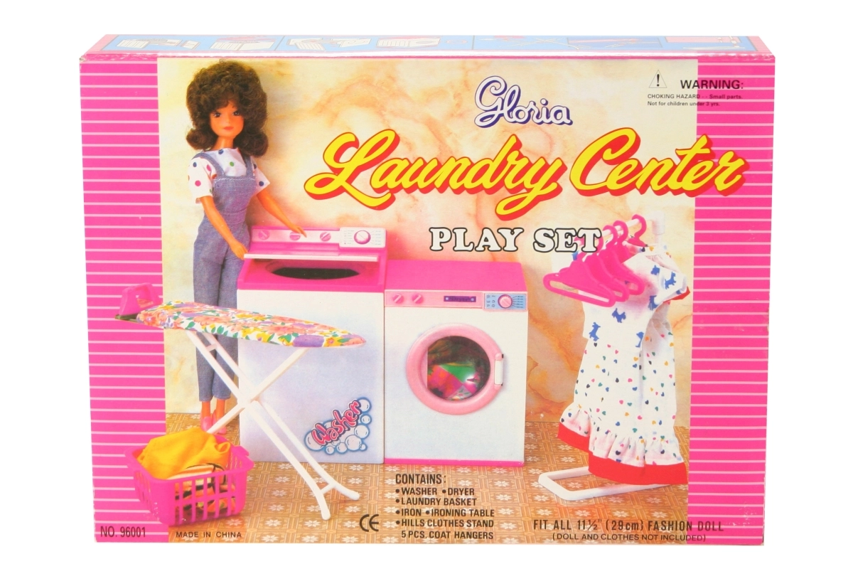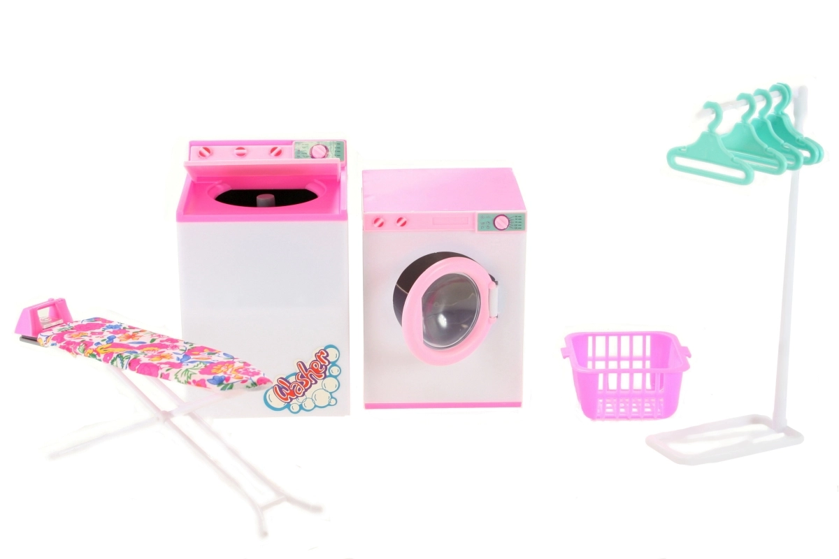 A szett mindent tartalmaz, amire a kis házigazdáknak szükségük lehet: kompakt mosógép és szárítógép, stabil vasalódeszka vasalóval, praktikus állvány vállfákkal és szennyeskosár. A baba és a ruhák nem részei a csomagnak. A játék 3 éves kortól ajánlott.