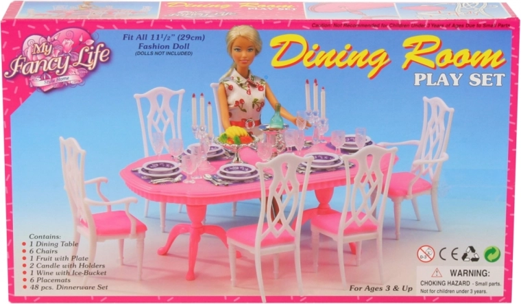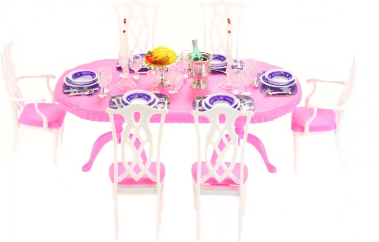 Glorie étkészlet ideális gyermekjátékokhoz, teljes étkezési felszereléssel. Tartalmaz egy nagy műanyag asztalt és hat széket, minőségi kiegészítőkkel.