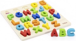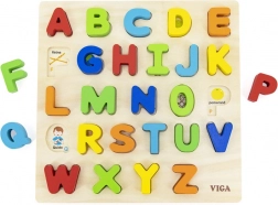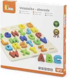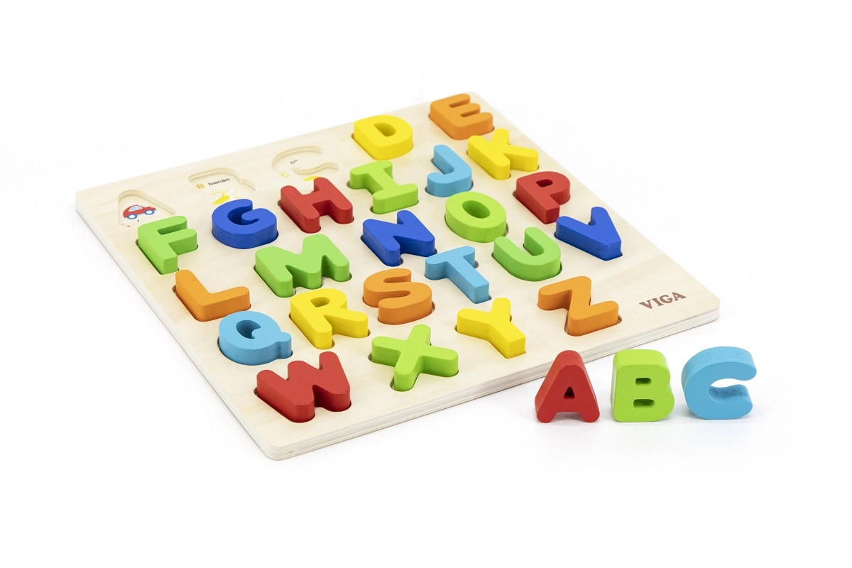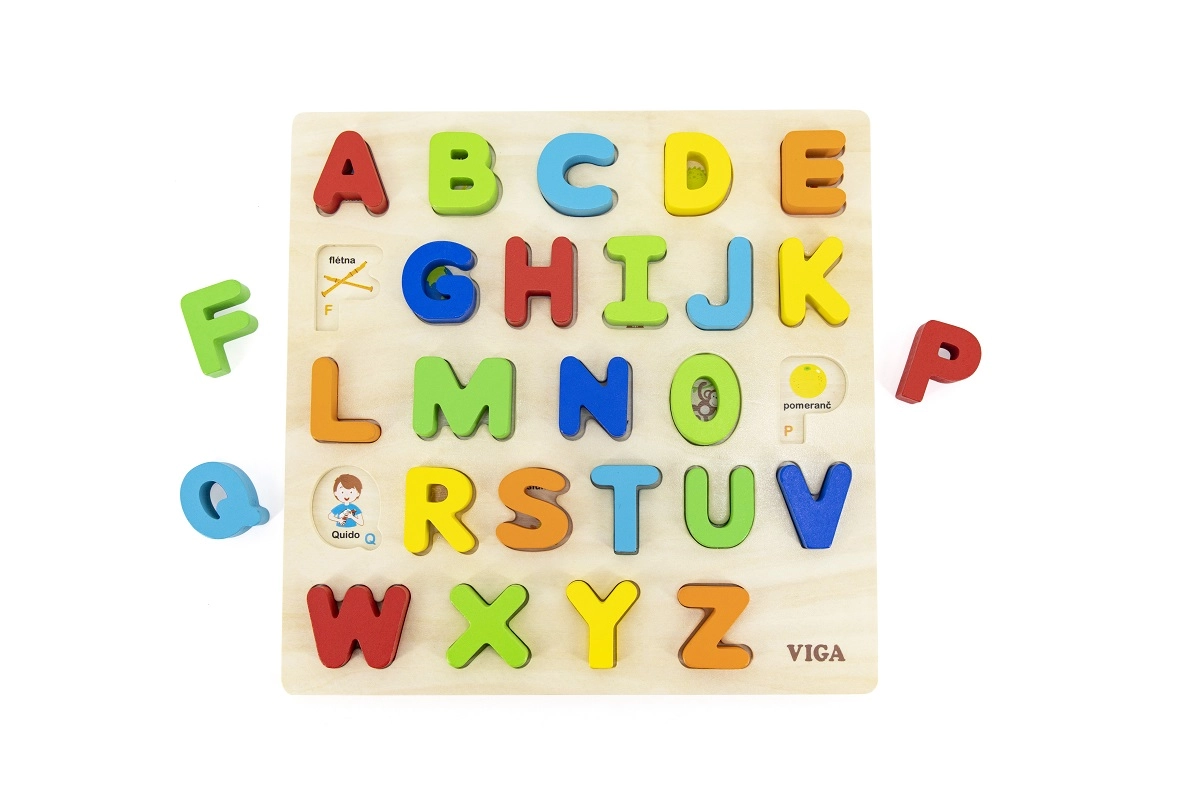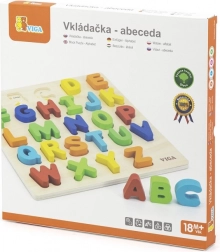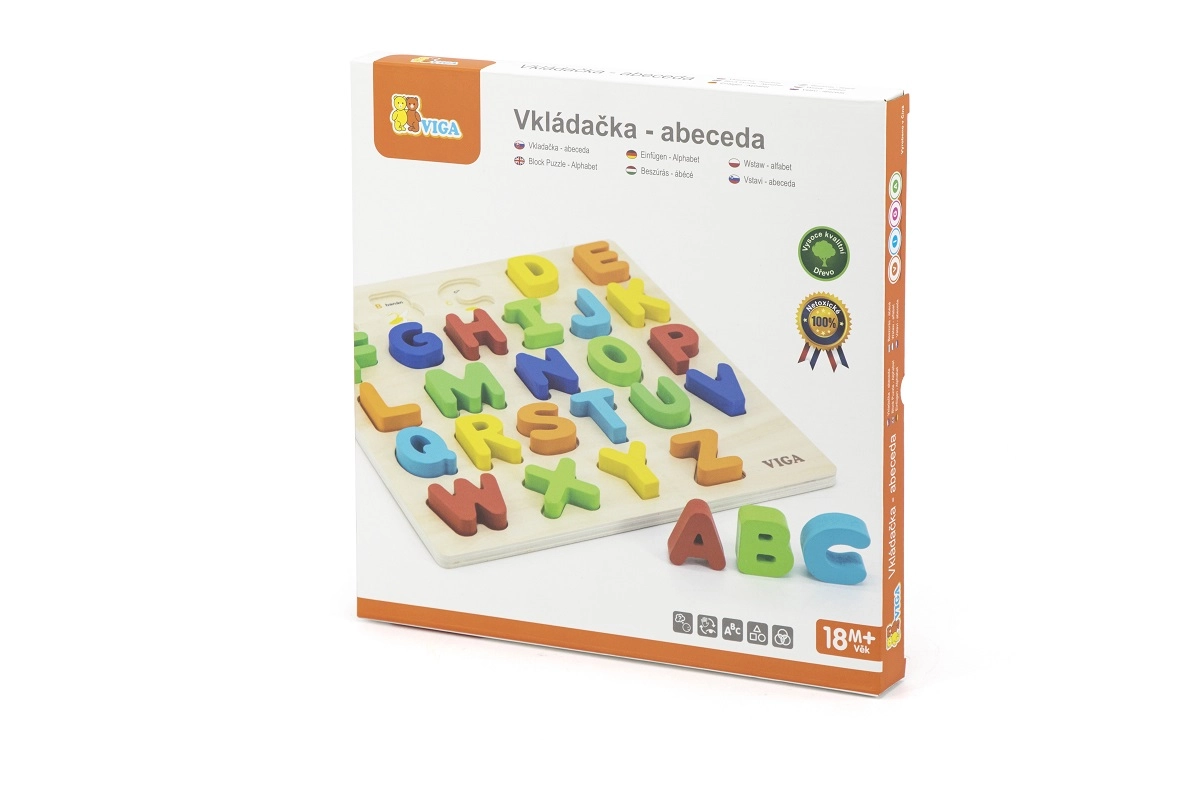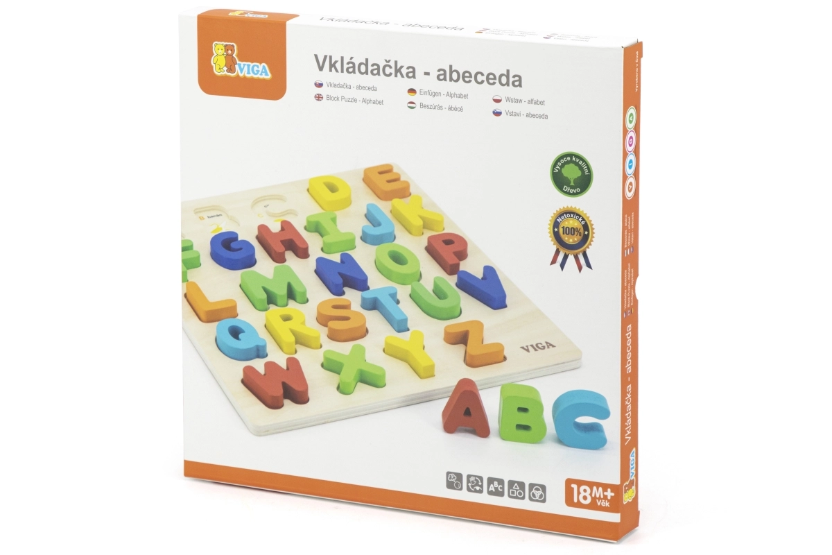 A cseh ábécé betűivel ellátott fa kirakó ideális játék a 18 hónaposnál idősebb kisgyermekek számára. Ez a játék támogatja a motoros képességek fejlesztését és a ábécé megismerését szórakoztató módon.