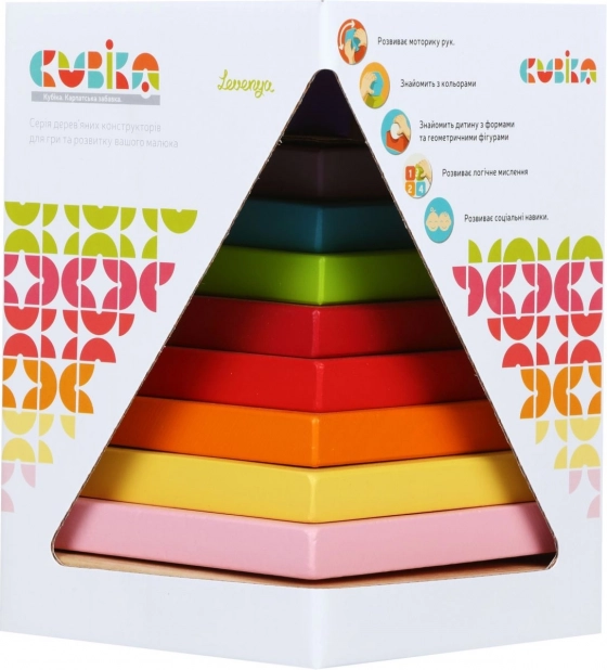 A Cubika márka ökológiai, fa játékokat kínál precíz kidolgozással és tetszetős dizájnnal. A Színes piramis egy 9 darabból álló kirakójáték, amely piramis formára rakható össze. Ez a játék nemcsak szórakoztató módon fejleszti a szenzomotoros képességeket, hanem logikai gondolkodást és kreativitást is.