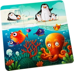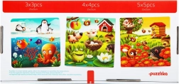 Rakj össze három különálló jelenetet 25 × 25 cm méretben: 3×3, 4×4 és 5×5 darabbal. A gyerekek természetesen emelik a kihívás szintjét, és önbizalmat építenek kirakás közben.