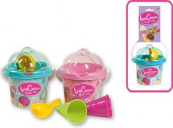 Bájos, fagylalt témájú gyerek homokozókészlet, amely örömet szerez minden kis építőnek. Tartalmaz egy pohár formájú fedeles vödröt, egy fagyigombócozót és 2 tölcsért. Olaszországban készült minőségi műanyagból, 12 hónapos kortól ideális. Könnyű, kompakt, és remek a homokozóban vagy a strandon.