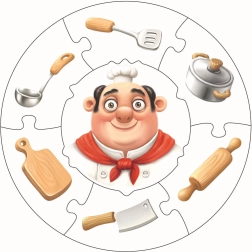 A szakácsot és eszközeit (fakanál, lábas, nyújtófa) ábrázoló illusztráció segíti a logika fejlődését és a mindennapi tevékenységek megismerését.