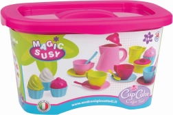 Az Androni márka stílusos kávés készlete bármely gyerekkonyhát kis kávézóvá varázsol. A szett mindent tartalmaz a baristás játékhoz – a kancsótól és csészéktől a bájos cupcake-ekig – és minőségi, erős és rugalmas műanyagból készül Olaszországban. A 24 darabos összeállításnak, a praktikus fedeles tárolódoboznak és a biztonságos kivitelnek köszönhetően ideális 18 hónapos kortól, sőt óvodákba is.