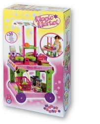 - Guruló kocsi levehető napellenzővel, oldalsó kihúzható pult, 4 kosár fogantyúval, pénztárgép érmékkel, mérleg tálkákkal, 12 db gyümölcs és zöldség, 8 dobozos áru