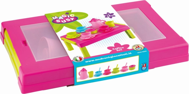Az ANDRONI kávés készlet örömet szerez minden kis baristának. A szett mindent tartalmaz a gyerekek teázós és kávézós összejöveteleihez, és az okos asztalkának köszönhetően, amely praktikus tárolódobozként is szolgál, minden tartozék mindig kéznél lesz. A színes kivitel játékra hív, és támogatja a társas interakciót és a finommotorika fejlődését.