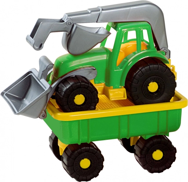 A Androni márkájú, masszív traktor rakodó levehető pótkocsival és hátsó kanállal 12 hónapos kortól órákig tartó szórakozást nyújt otthon és a szabadban. A pótkocsi fedele levehető szitaként szolgál, az egész jármű pedig minőségi, erős és rugalmas műanyagból készült Olaszországban. 58 cm-es hossza miatt homokozóba és kertbe is ideális, és nagyobb terhelést is bír – óvodákba is kiváló.