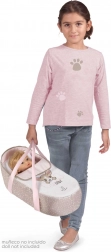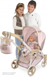 Elbűvölő babakocsi rózsaszín–bézs árnyalatokban, amely remekül ötvözi a dizájnt és a funkcionalitást. Az állítható mózeskosár-fekvőrész egyszerűen sportüléssé alakítható, így a játék még életszerűbb. A szett része egy hordozó táska is puha bársony DIDI hímzéssel és praktikus szélfogó betéttel.