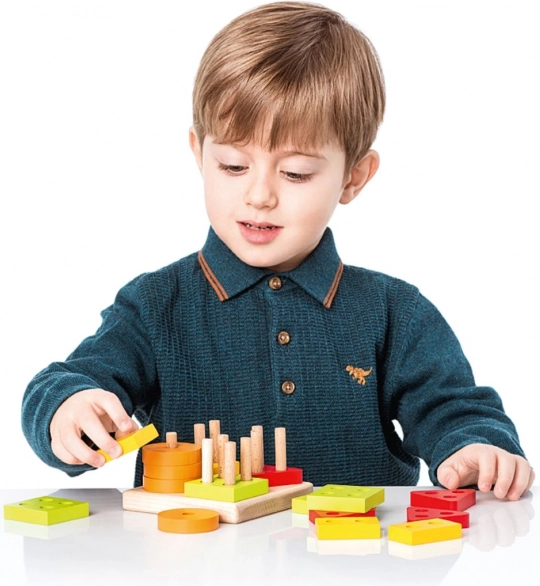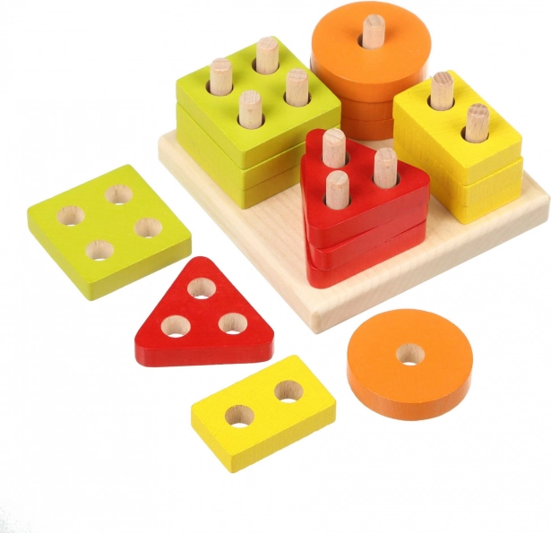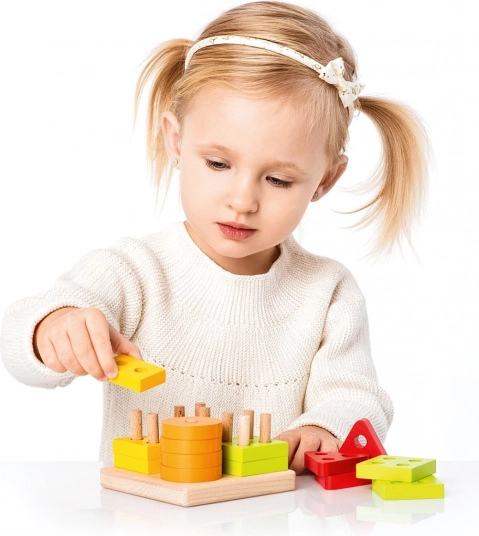 Színes körök, négyzetek, háromszögek és téglalapok nyílásokkal, melyeket az alap pálcáira kell ráhelyezni. A gyerekek így természetesen válogatnak forma és szín szerint, és gyakorolják a logikus gondolkodást.