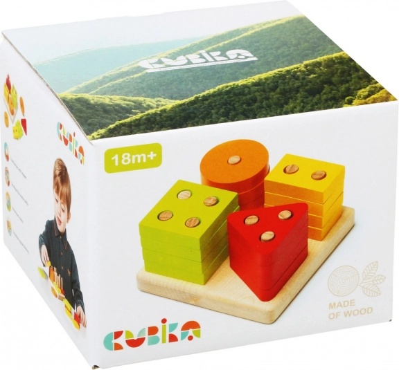 A CUBIKA Válogatjuk a formákat didaktikus gyerekjáték 16 színes, perforált geometriai elemet és egy masszív négyzet alakú alapot tartalmaz pálcákkal. A gyerekek természetes módon fedezik fel a formák és színek közötti különbségeket, fejlesztik a fogást és a szem–kéz koordinációt, valamint a képzeletet és a türelmet. A gondos kivitelezés juhar- és bükkfából, valamint a tartós, egészségre ártalmatlan, vízbázisú festékek hosszú élettartamot és biztonságos játékot garantálnak.