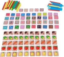 A csomag tartalmaz fa kártyákat számokkal, kockapontokkal, gyümölcs- és zöldségképekkel, továbbá matematikai jeleket és 8 cm hosszú színes számoló pálcikákat. Az elemek kellemes tapintásúak és strapabíróak a mindennapi játékhoz.