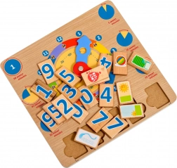 A készlet része 14 számos blokk és 6 képes blokk a napi tevékenységekhez. Négy időblokk beilleszthető az előkészített nyílásokba a digitális idő kirakásához, míg az ötödik blokk a megfelelő tevékenységet ábrázolja. Így a gyerekek vizuálisan kapcsolják össze az analóg órát a digitális kijelzéssel és a megszokott napi rutinnal.