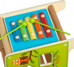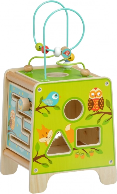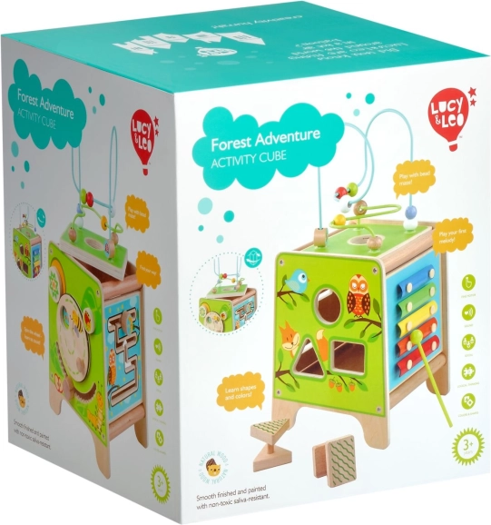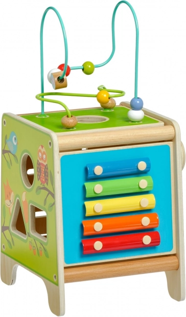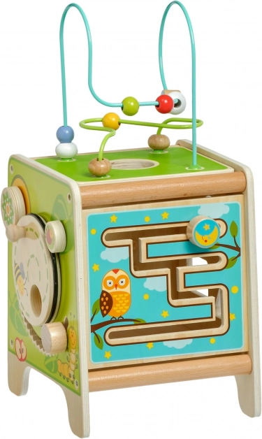 Ez a színes fa aktivitáskocka órákig tartó, értelmes játékot kínál. A felső gyöngylabirintus kivehető és befelé fordítható a kockába az egyszerű tárolás érdekében. Az oldallapokon a gyerekek xilofont ütőkkel, kétrészes forgó geometriai formák formabedobóját, motoros labirintust, forgó kereket, forgó elemeket és egy szórakoztató játékot találnak, ahol egy kis pálcikát kell vájatban tologatni.