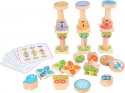 A blokkok tartós fából készültek, sima, lekerekített élekkel, és kellemes fogásúak. A játék támogatja a koncentrációt, a logikus gondolkodást és a formafelismerést, miközben a gyerekek türelmet és pontosságot gyakorolnak stabil tornyok és minták építése közben.