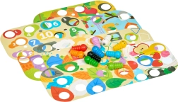 Alap fa tábla, 9 cserélhető sablon, 10 színes mágneses hernyó, mágneses pálca, 3 forgatható levél, 3 rögzítő pálcika, lenvászon tasak