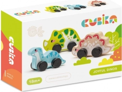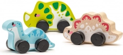 A készlet három kerekekkel ellátott fa dinoszauruszt tartalmaz a könnyű mozgásért, ideális a legkisebbek számára.