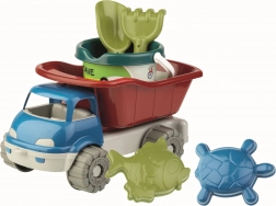 Androni homok készlet, amely újrahasznosított műanyagokból készült, szórakozást kínál a kisgyerekek számára. Tartalmaz egy kisautót, vödröt, lapátot, gereblyét és két tengeri témájú formát, ideális homokhoz vagy a strandra.