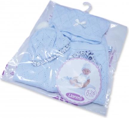 A 26 cm-es újszülött baba ruha tartalmaz egy pulóvert, egy sapkát és egy bugyit. Úgy tervezték, hogy maximális kényelmet és eleganciát biztosítson a babával való játék során. A csomagolás egy finoman kötött takarót is tartalmaz, amely kiegészíti az összképet. Ez a készlet átlátszó csomagolásban van műanyag vagy karton vállfával.