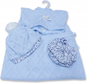 Tartalmaz egy pulóvert, egy sapkát és bugyit, 26 cm-es méretű babák számára tervezve.
