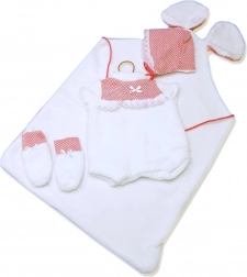 A csomag tartalma egy 3 részes szett és egy dekoratív, füles alátét a még nagyobb mókáért a babáról való gondoskodás során. Műanyag tasakban, műanyag vagy karton vállfával csomagolva – könnyen tárolható és ajándékozható.