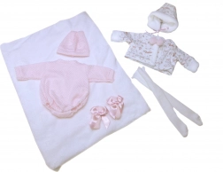 Ez a 6 darabos ruha szett tökéletes kiegészítője lesz az Újszülött Llorens babádnak, amely 43-44 cm méretű. A szett tartalmaz egy dekoratív, kétoldalú, masnival díszített fleece takarót, amely garantáltan melegen tartja babádat.