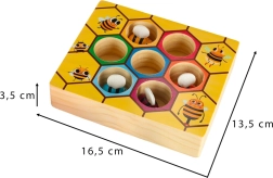 A játék segíti a finommotorika és a kéz-szem koordináció fejlesztését a színes méhecskékkel való szórakozás során.
