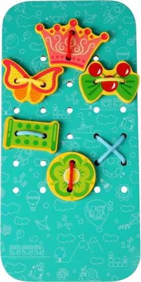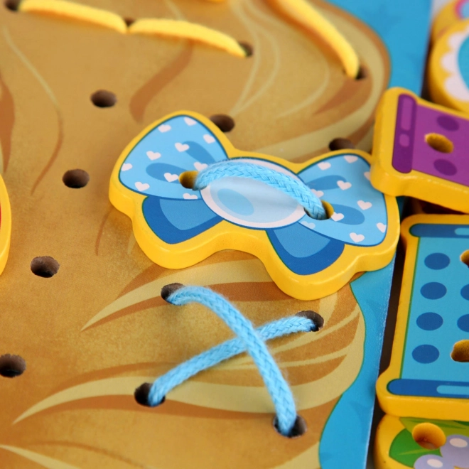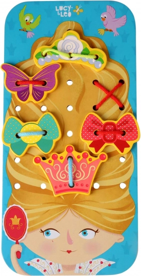 A fa fűzős készlet – Hercegnő játékos tanulást és rengeteg ötletes szórakozást kínál. A nagy hercegnős alaplapon a gyerekek saját frizurákat készíthetnek, és koronákkal, masnikkal vagy pillangókkal díszíthetik, amelyeket cipőfűzőkkel erősítenek a kialakított nyílásokba. A tevékenység fejleszti a türelmet, a koncentrációt és a finommotorikát.