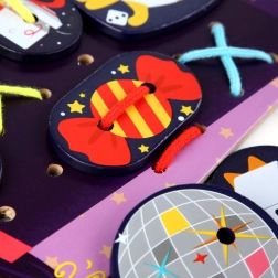 Ez a szórakoztató fűző és átfűzős készlet bűvész témával a képzelet világába hívja a gyerekeket. A nagy alaplapra, amelyen a bűvész feje és kalapja látható, a zsinórok segítségével színes kiegészítőket rögzíthetnek – a nyuszitól és érméktől a titokzatos kártyákig. Játék közben a gyerekek gyakorolják a szem–kéz koordinációt, a türelmet és az alkotókészséget.