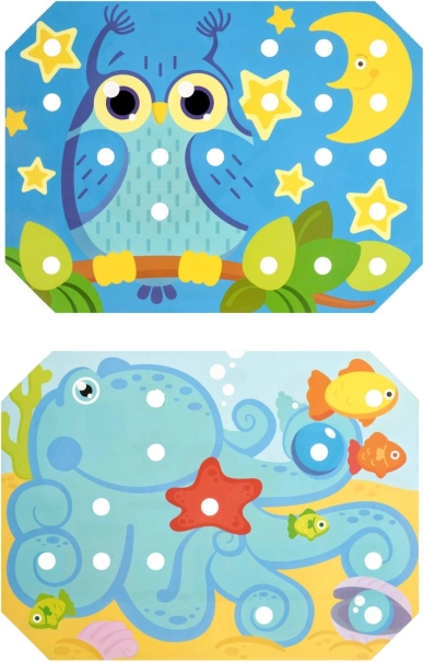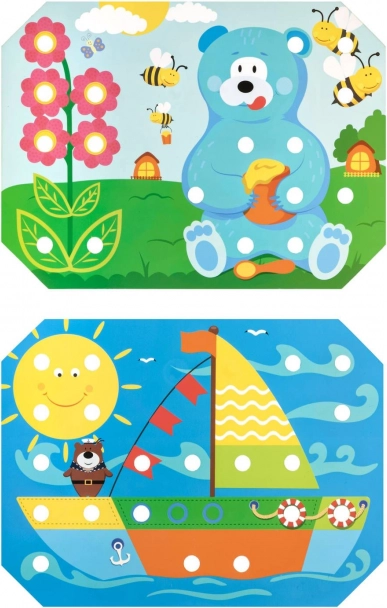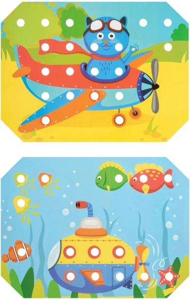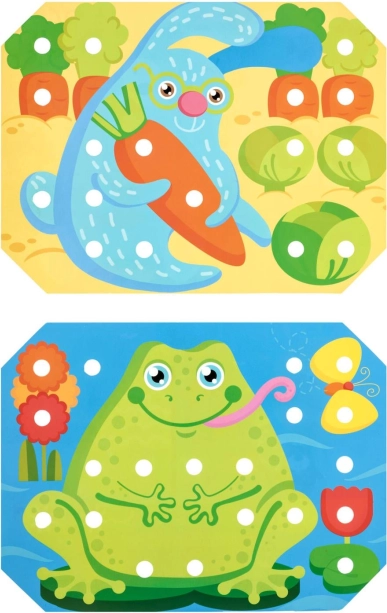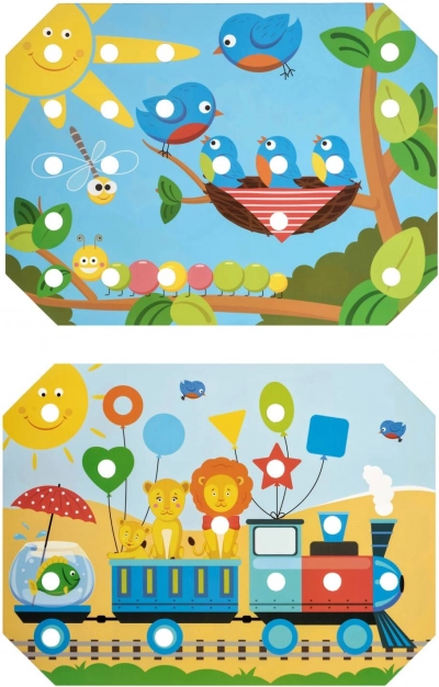 A gyerekek kiválasztanak egy színes sablont, ráhelyezik a fa alaplapra, majd a képet csipesszel vagy kézzel helyezett pöckökkel töltik ki. A mellékelt zsinórokkal a fűzést és „hímzést” is gyakorolhatják. A játék természetes módon támogatja a koncentrációt, a logikát, a türelmet és a pontosságot.