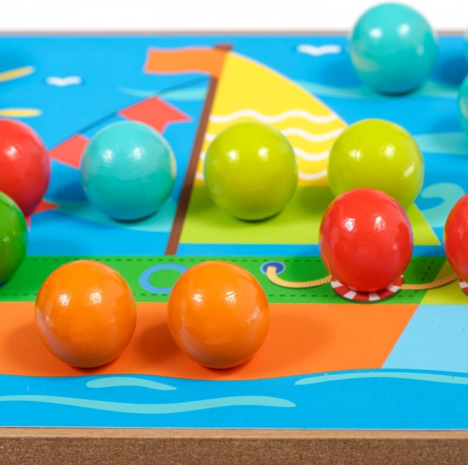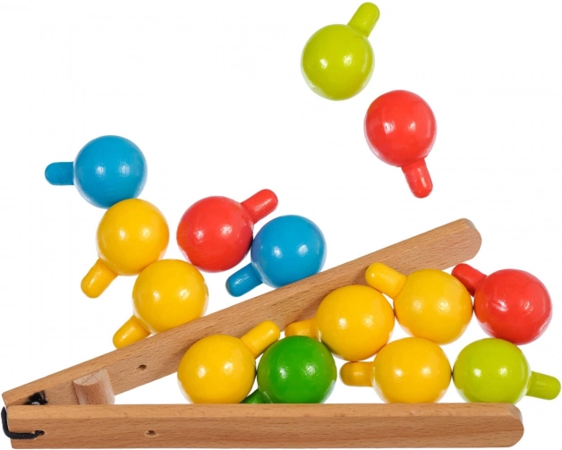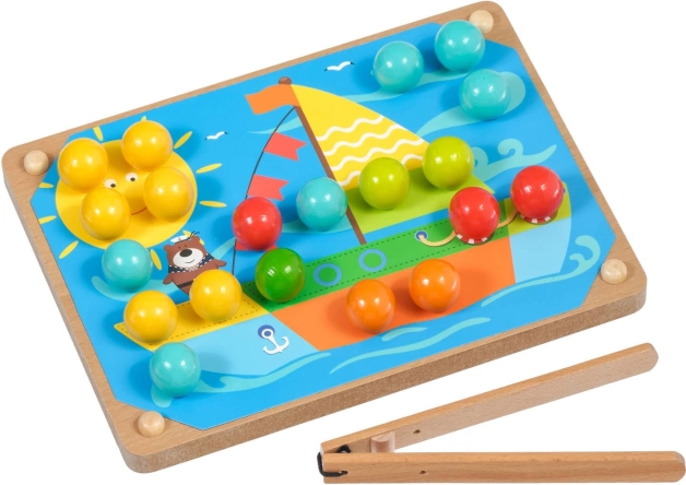 A lyukakkal ellátott fa alap, a színes pöckök és a csipesz ösztönzik a gyerekeket a pontos fogásra, fejlesztik a finommotorikát és a kéz–szem koordinációt.