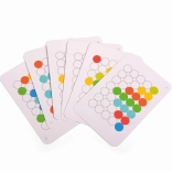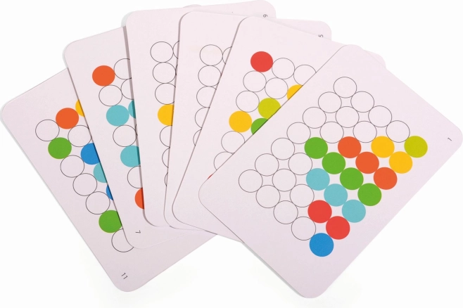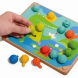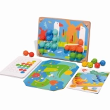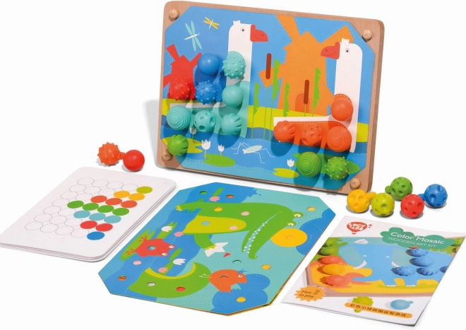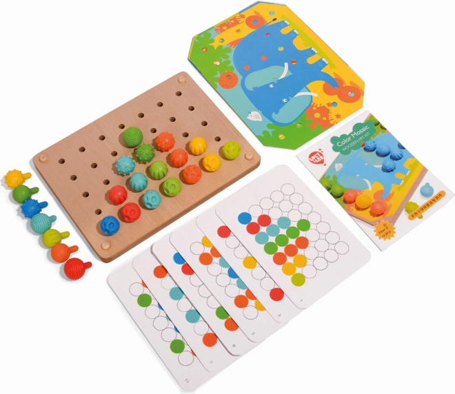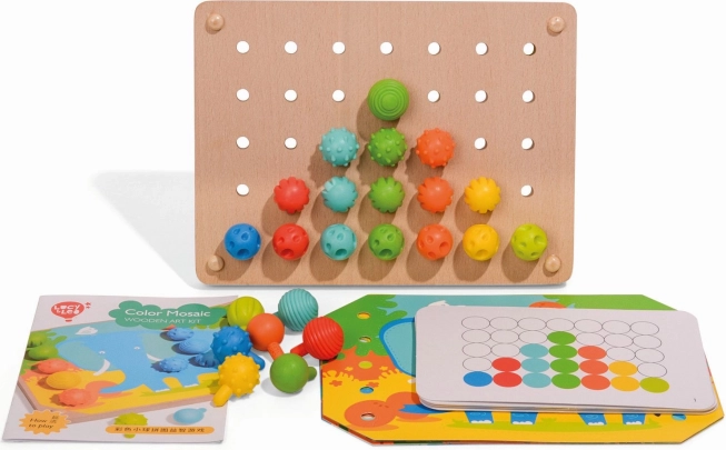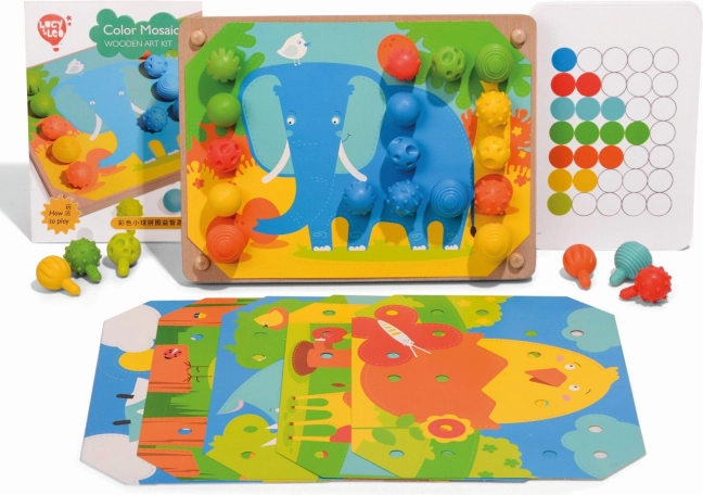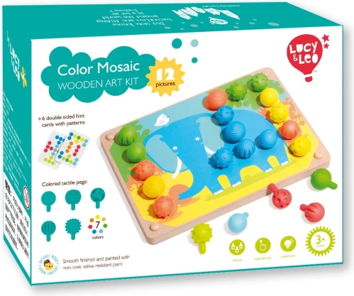A mozaik és fűzés remek eszköz a kisgyermekek számára a finommotorikus készségek és a kreativitás fejlesztéséhez. 35 nagy, hét élénk színben elérhető szilikon csapot tartalmaz, amelyekkel a gyerekek kitölthetik a színes előlapokat. A szett 12 színes állatos képet és 6 kétoldalas sablont is tartalmaz.
