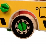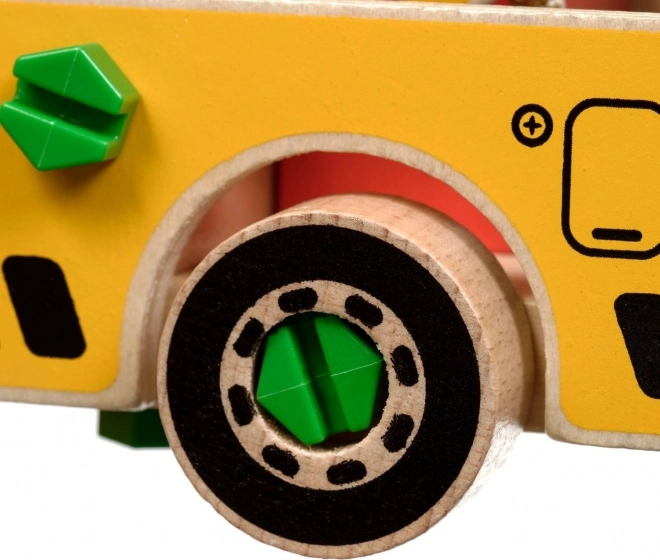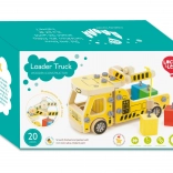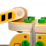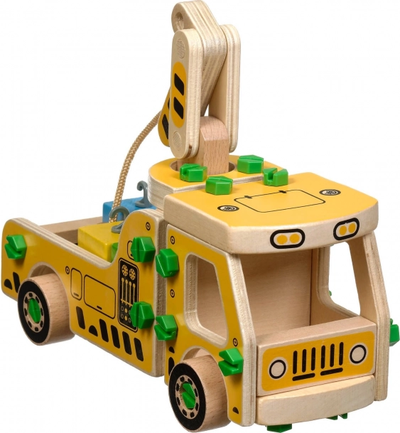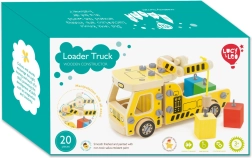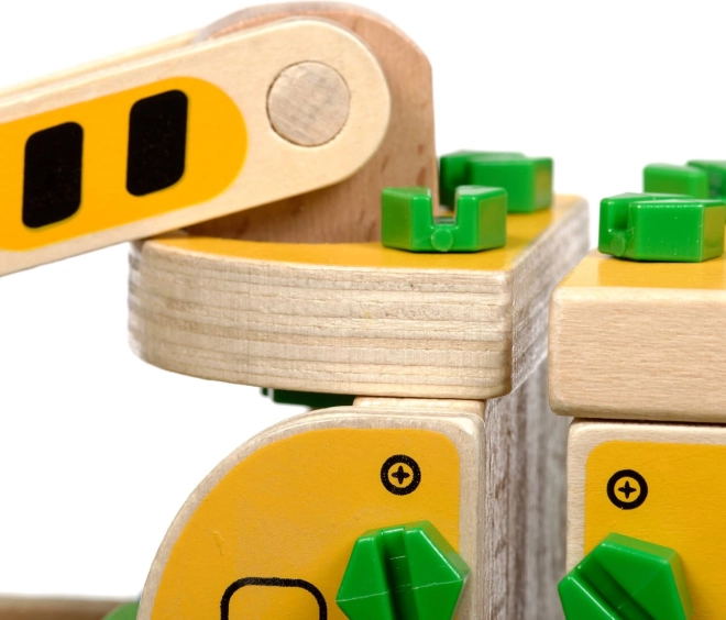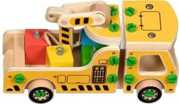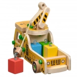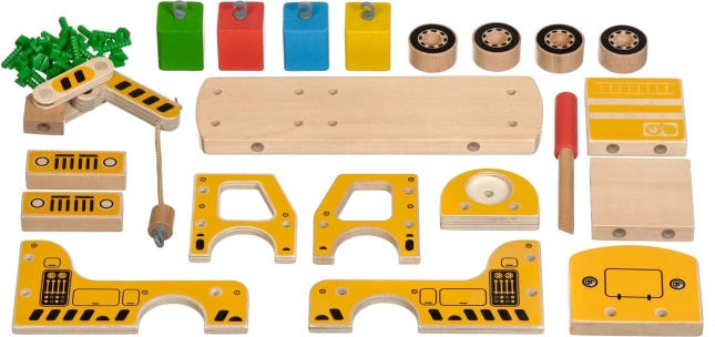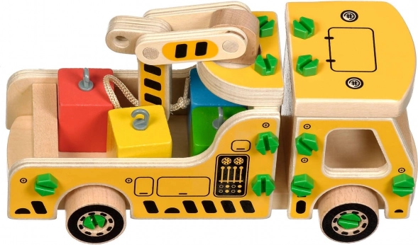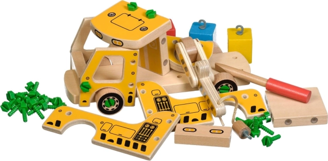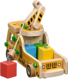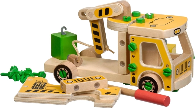 A csomag 16 faelemet tartalmaz a daru összeállításához, csavarokat, csavarhúzót és 4 színes kockát, amelyek a rakományt képviselik. A játék egyben Montessori eszközként is szolgál, amely hatékonyan segíti a gyermek különböző készségeinek fejlesztését.