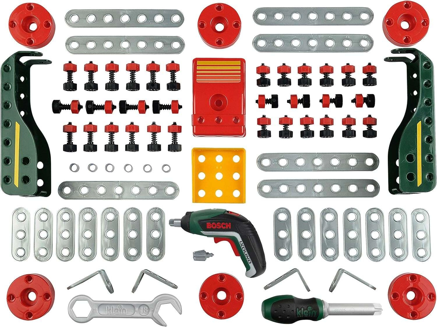 A csomag 77 gondosan megtervezett komponenst tartalmaz – összekötő léceket, szögeket/konzolokat, kerekeket, csavarokat és anyákat – valamint kéziszerszámokat, mint a villáskulcs és csavarhúzó. Az ergonomikus Ixolino gumírozott markolattal és bal/jobb forgásirány funkcióval megkönnyíti a csavarozást a kis kezek számára.