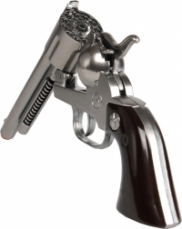 Stílusos kovboj revolver klasszikus designnal, amely örömet szerez a kis pisztolyhősöknek és a western hangulat kedvelőinek. A fém test tartósságot és kellemes súlyt ad a kézben, míg a feltűnő csővég egyértelművé teszi, hogy biztonságos játékról van szó. A 12 lövéses forgódobnak köszönhetően a játék gördülékeny és szórakoztató.